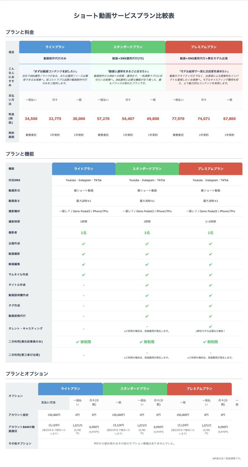 ショート動画サービスプラン比較表